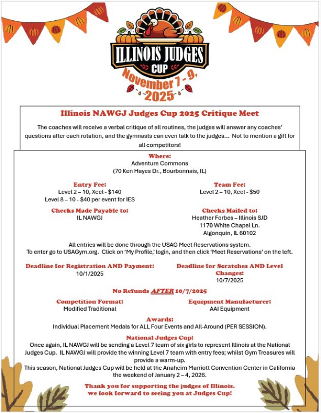 - The National Judges' Cup will be held January 2-4 In Anaheim, CA. IL NAWGJ will be reimbursing expenses up to $3000 for one IL judge to attend. Please reach out to Heather Forbes ASAP if you are interested in attending this meet. ilsjdheather@gmail.com
